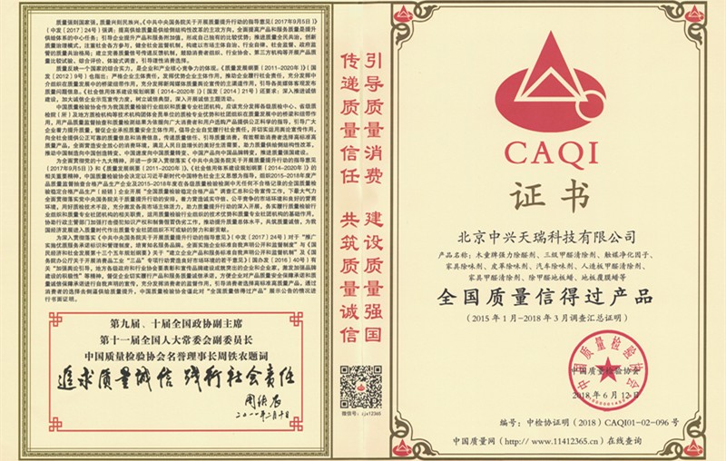 木童除甲醛產品榮獲2018年全國質量信得過產品稱號